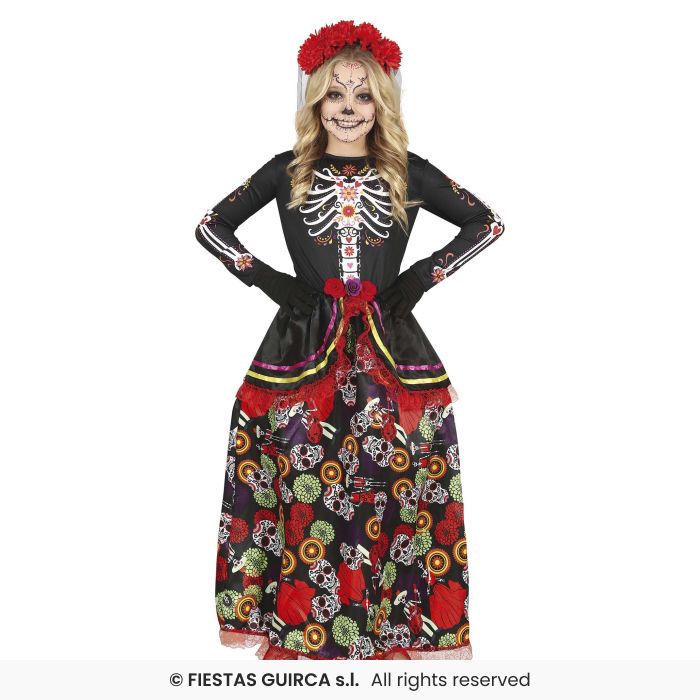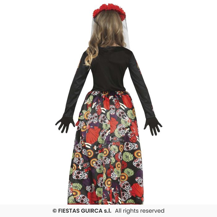 Incluye vestido negro con volantes de colores y dibujo del día de los muertos, diadema negra con rosas rojas y velo.