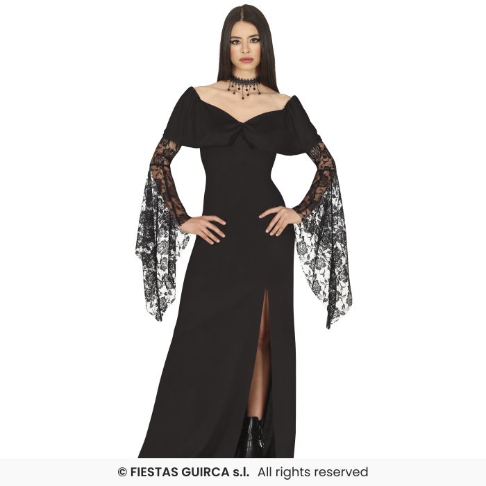 Disfraz de Morticia, incluye vestido con mangas de puntilla.